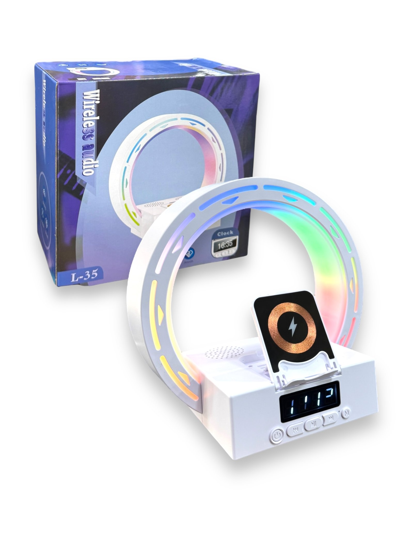 El cargador inalámbrico con parlante L-35 es un dispositivo multifunción diseñado para simplificar tu espacio y mejorar tu experiencia diaria 📱🎶. Combina carga inalámbrica, parlante Bluetooth, luz LED RGB y reloj digital en un diseño moderno y elegante.
