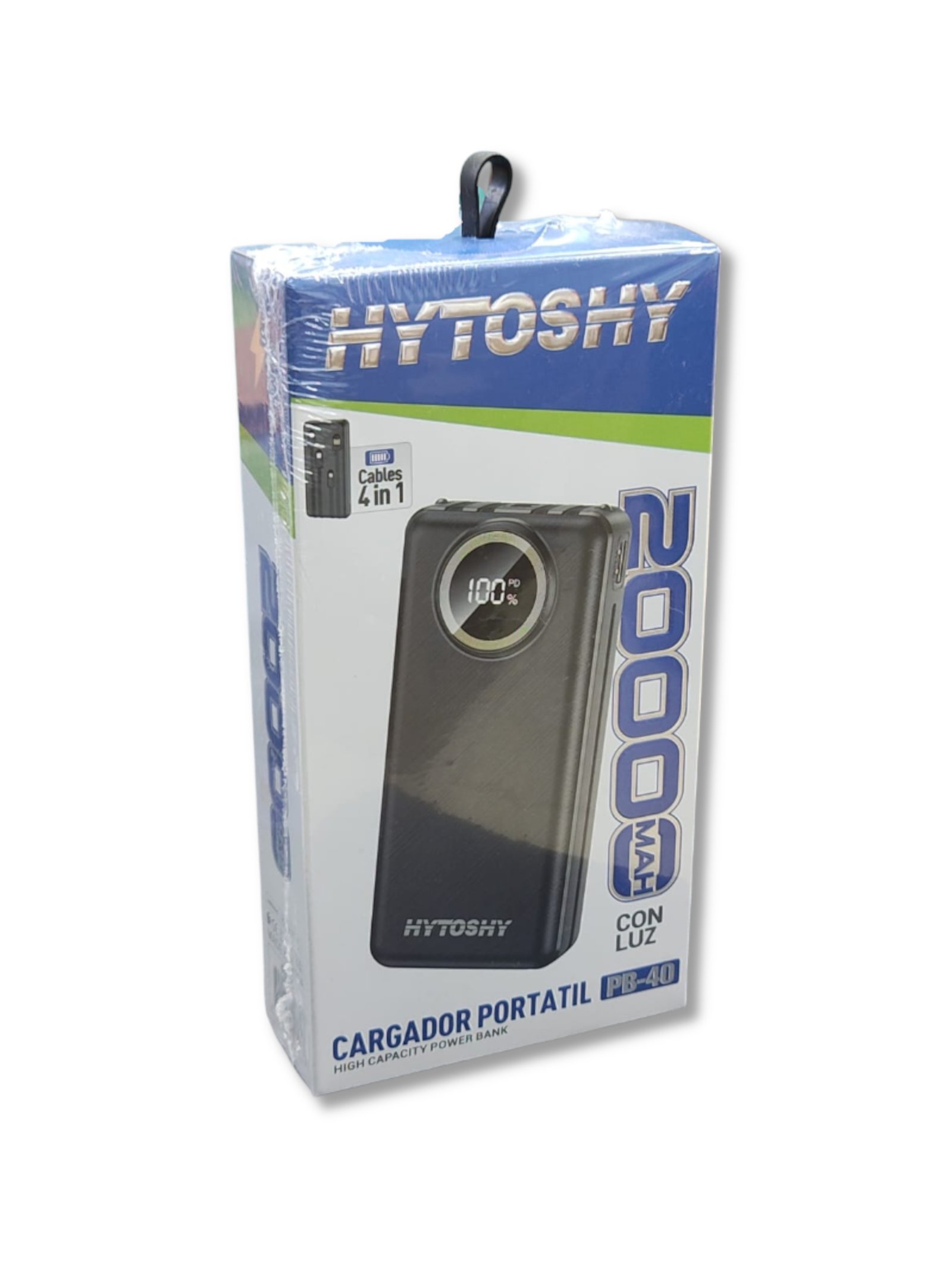 Cargador portátil Hytoshy PB-40 de 20000mAh 🔋 con pantalla digital, luz LED y cables 4 en 1 integrados. Potente, práctico y confiable.