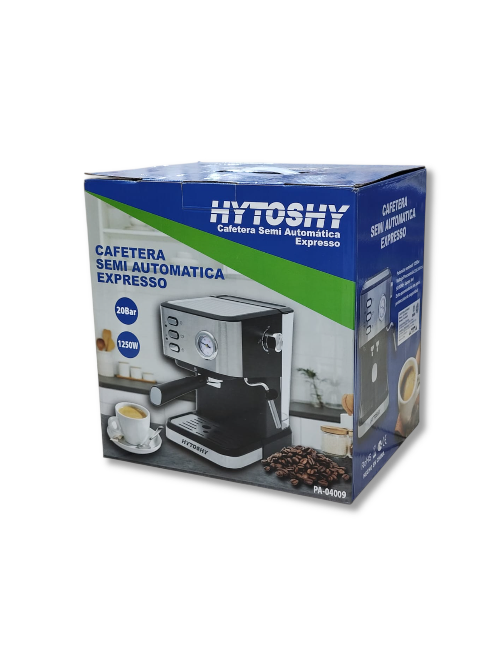 Cafetera espresso Hytoshy con 20 BAR de presión y potencia de 1250W. Prepara café espresso, capuchino y bebidas a base de café con espuma de leche. Diseño sólido ideal para uso diario en casa.